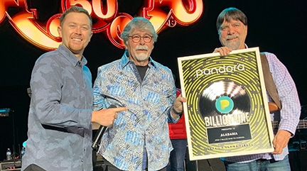 McCreery, a previous recipient of the Pandora Billionaire plaque, was thrilled to make the presentation. “I’ve been a fan of ALABAMA all my life,” he explains. “It was an honor to open for them in Roanoke and then present the Pandora Billionaire plaque to Randy and Teddy later that night. It doesn’t get better than ALABAMA.”