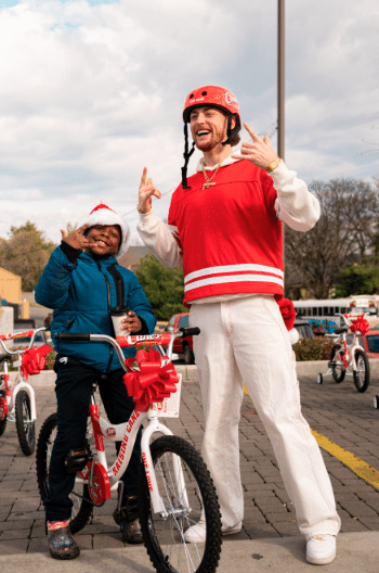 The hands-on event found Zimmerman greeting kids, helping pass out bikes, and posing for plenty of photos, turning the giveaway into an unforgettable experience for the families in attendance. Zimmerman also spoke with local media about the importance of giving back during the holiday season and why partnering with Raising Cane’s to support Nashville’s youth felt especially meaningful.