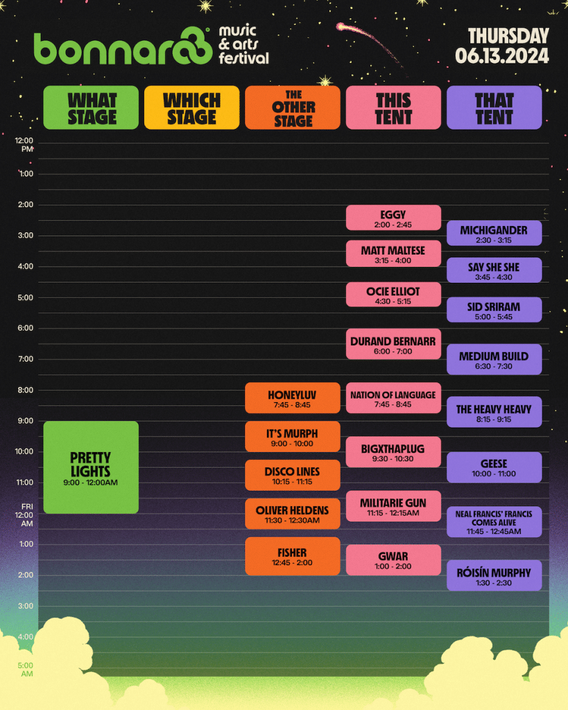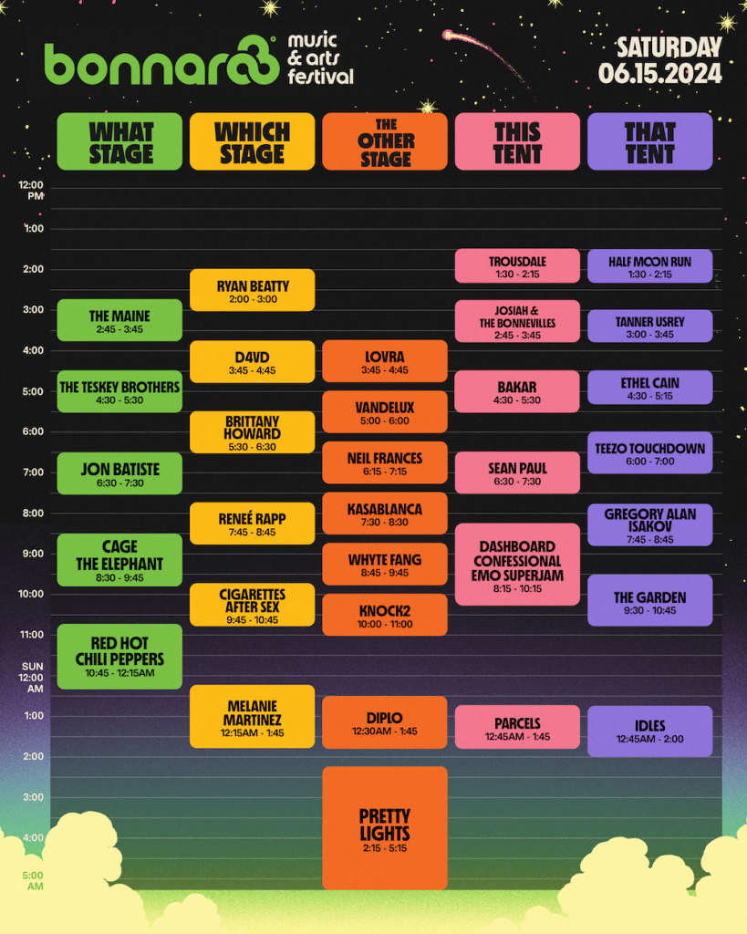 The Bonnaroo schedule is out extra early this year! Check out what times your favorite artists are playing What, Which, This, That and The Other Stages now and start planning out your mad dashes across Centeroo. Outeroo schedule’s coming soon! Stay tuned to Nashville.com for updates.