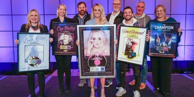 Carrie Underwood celebrated the RIAA Platinum certification of her latest album, Cry Pretty, as well as, four certified singles from the album this past Friday in Nashville. Following her CRS (Country Radio Seminar) Artist Interview at the Omni Hotel, Underwood was surprised onstage with a Platinum plaque from UMG Nashville CEO & Chairman, Mike Dungan, and President, Cindy Mabe, for her sixth studio album and the first she co-produced alongside David Garcia.