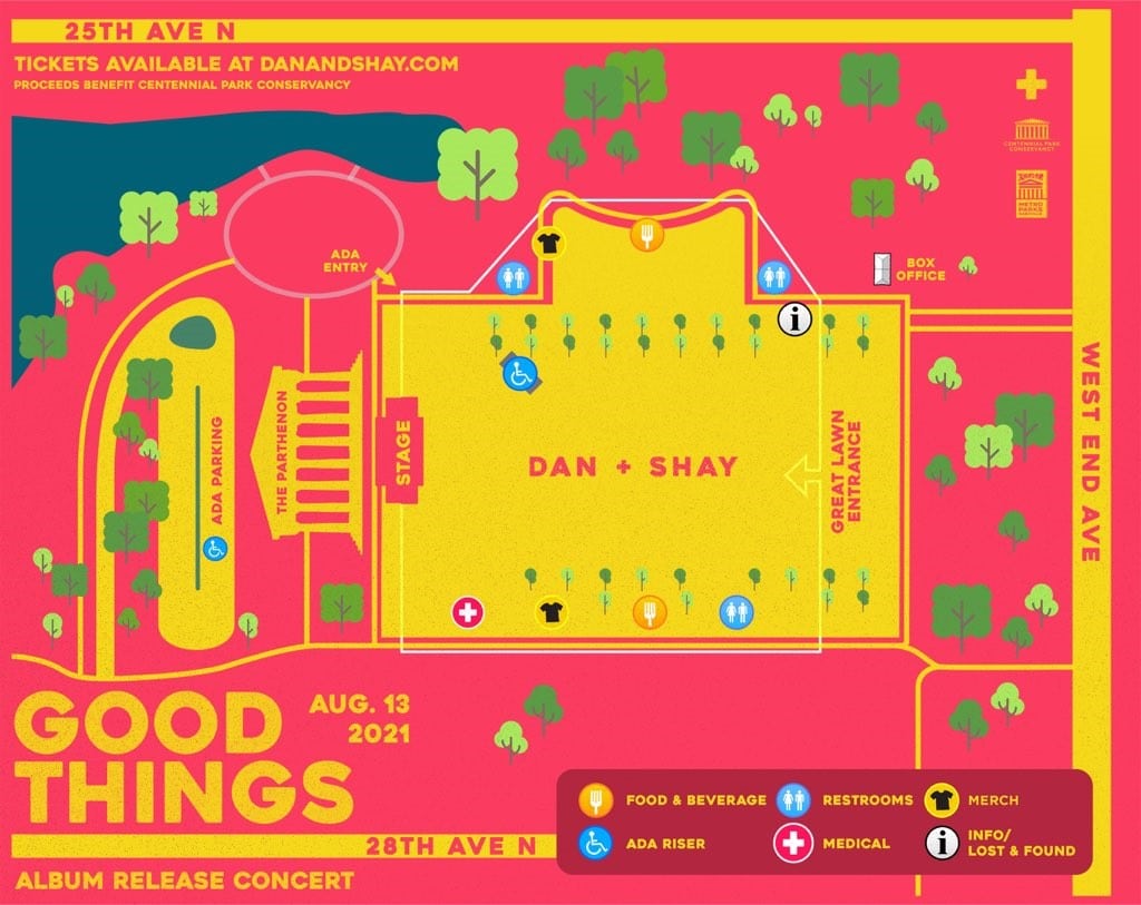 A full, festival production headline concert set from from Dan + Shay that with include songs off their new album Good Things along with no shortage of hits from the duo’s catalog from a massive stage with large video screens on all sides to ensure visibility from anywhere in the park. Food & beverage vendors highlighting local Nashville businesses.