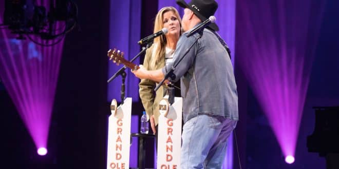 Opry members Garth Brooks and Trisha Yearwood stepped into the circle tonight bringing millions of fans from all around the world together for the Grand Ole Opry’s 4,922nd consecutive Saturday night broadcast. In addition to performing their own hits, the couple performed favorites from other giants in country music including Merle Haggard, George Strait, and Emmylou Harris, to name just a few. The two dueted on the George Jones/Tammy Wynette classic “Golden Ring” and also on their own “Whiskey To Wine.” The night marked the 10th anniversary of the Opry House having flooded in the Tennessee floods of 2010.