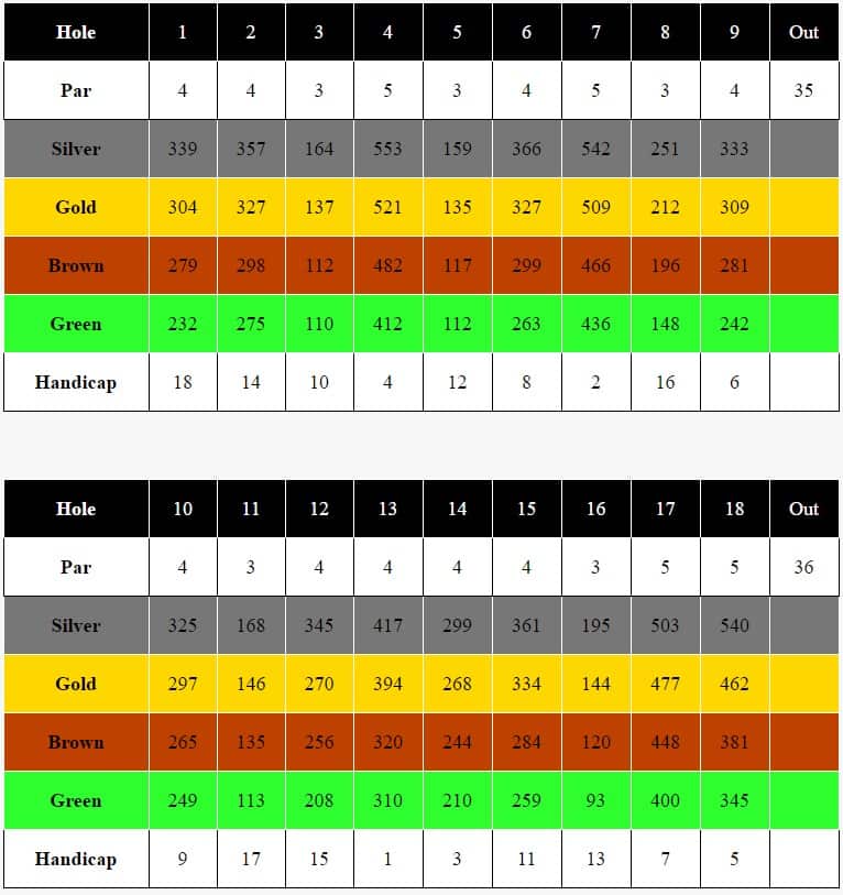 For players who are working to master the skills of ball flight and generally carry is less than 100 yards. Total yardage: 4,417 yards, Course Rating/Slope: 65.5/110