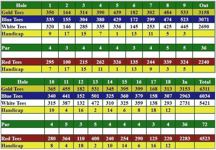 This course holds a Slope rating of 125 and a Slope rating of 71.6 for 6,317 yards of play with a par 72 for 18 holes. Originally built in 1968, this course opened as a 9-hole course and had the remaining 9 holes designed by Kevin Tucker and added in 1994.