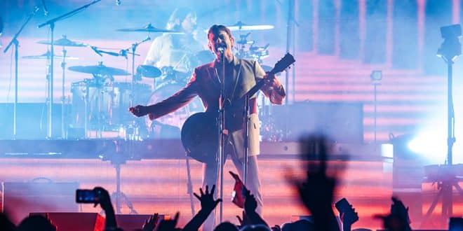 Last Thursday night, Kings of Leon delivered a electrifying performance at Bridgestone Arena, marking the 35th stop of their “Can We Please Have Fun” tour. The band, which formed in Mt. Juliet, Tennessee, 25 years ago, treated their hometown crowd to an unforgettable evening of music and visuals.