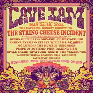 One of Nashville.com’s favorite festivals in the world is Cavefest in Pelham Tennessee and now The Caverns have announced a brand new 3-day, multi-stage camping festival, “CaveJam.” The String Cheese Incident will headline CaveJam in 2024 over Memorial Day Weekend, May 24-26. During the festival, The String Cheese Incident will play two nights with three sets above ground and one special set inside The Caverns world-renowned subterranean venue. All told, the festival will see 20 artists and bands on its stages above and below ground.