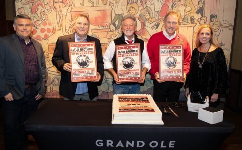 Last week, the brothers celebrated the occasion while performing on a special Christmas edition of the Opry’s broadcast. Backstage, the Gatlins were presented with a cake and special Hatch Show Prints to commemorate their upcoming 45th anniversary as members of the historic institution.