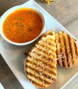 Grilled Cheese Sandwich with Tomato Basil Soup: A comforting classic, the Grilled Cheese Sandwich with Tomato Basil Soup is a simple yet delightful pairing. The sandwich features Muenster cheese melted between slices of buttery, toasted bread, achieving the perfect gooey, crispy combination. Served alongside a warm bowl of tomato basil soup, which is rich, slightly sweet, and bursting with fresh basil tomato flavor, this dish is the ultimate in comfort food for kids and adults alike and is perfect for a cozy lunch or light dinner.