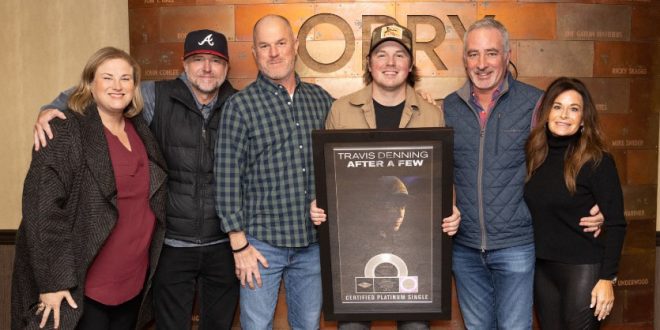 Mercury Nashville Recording artist Travis Denning just celebrated a new milestone, with the news that his first-ever No. One hit single “After A Few” has officially been certified PLATINUM by the RIAA, with over One Million units of the song being consumed since its release. Denning was surprised by his team at Universal Music Group, Red Light Management and the RIAA following his performance at Grand Ole Opry in Nashville, TN last night. Denning co-wrote “After A Few” with Kelly Archer and Justin Weaver.
